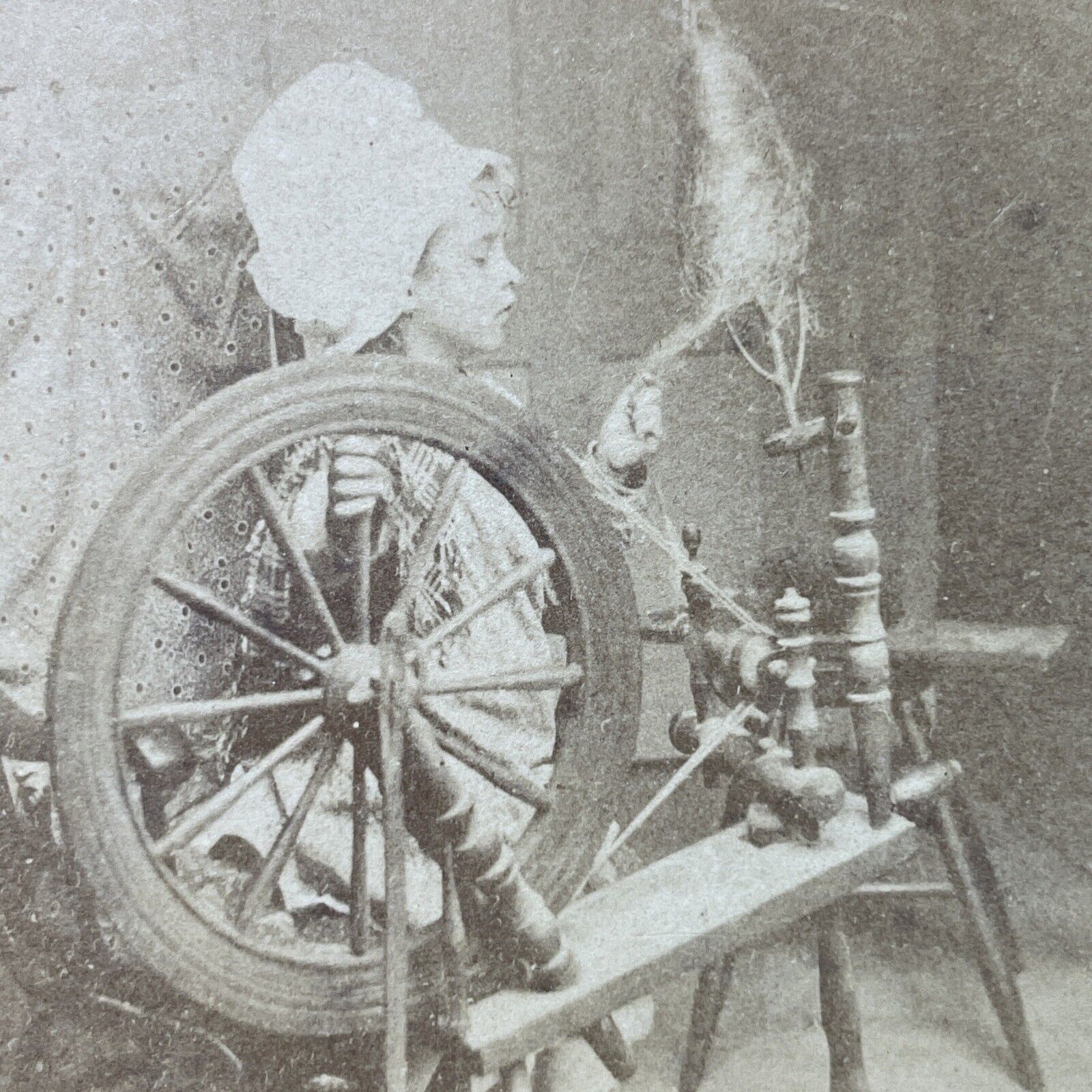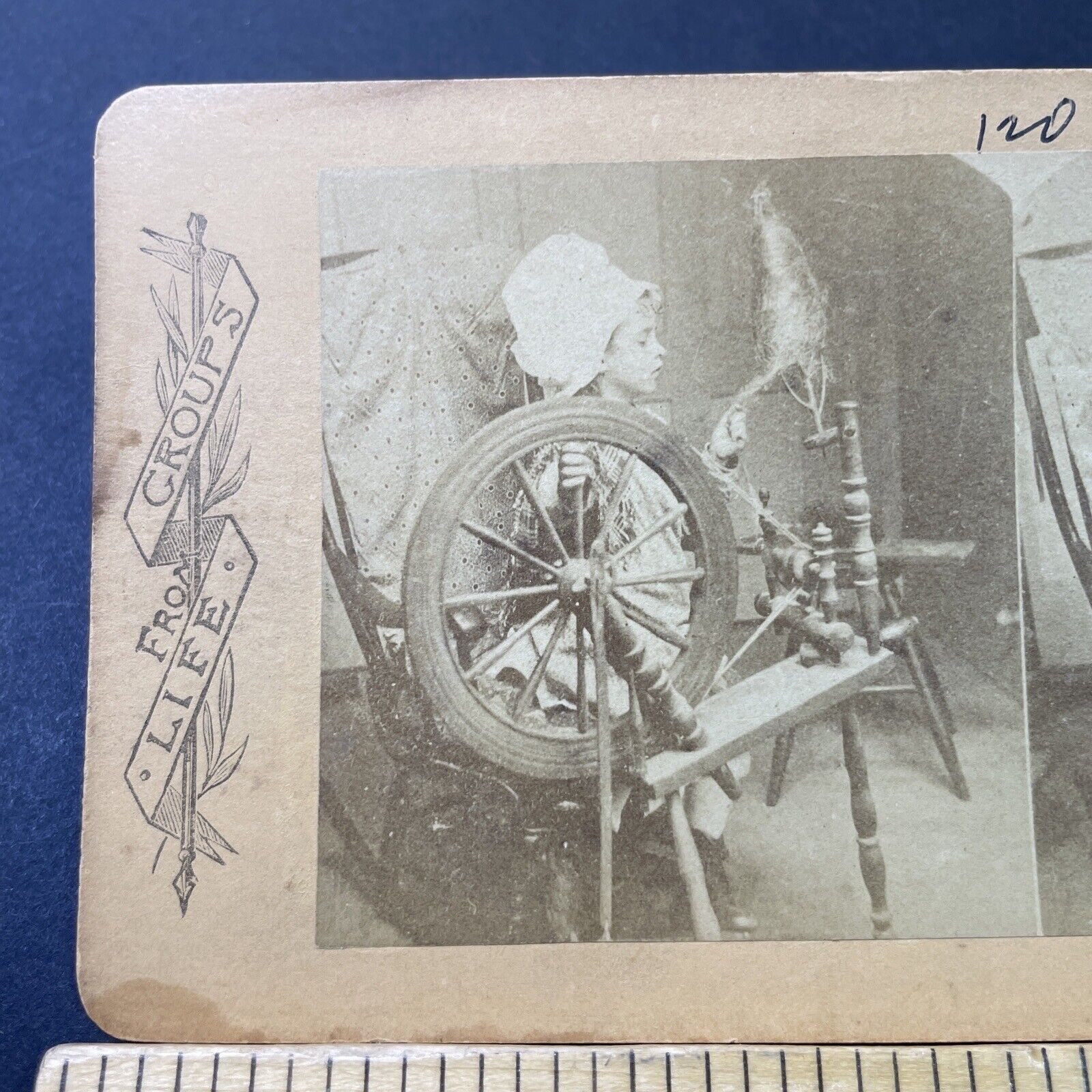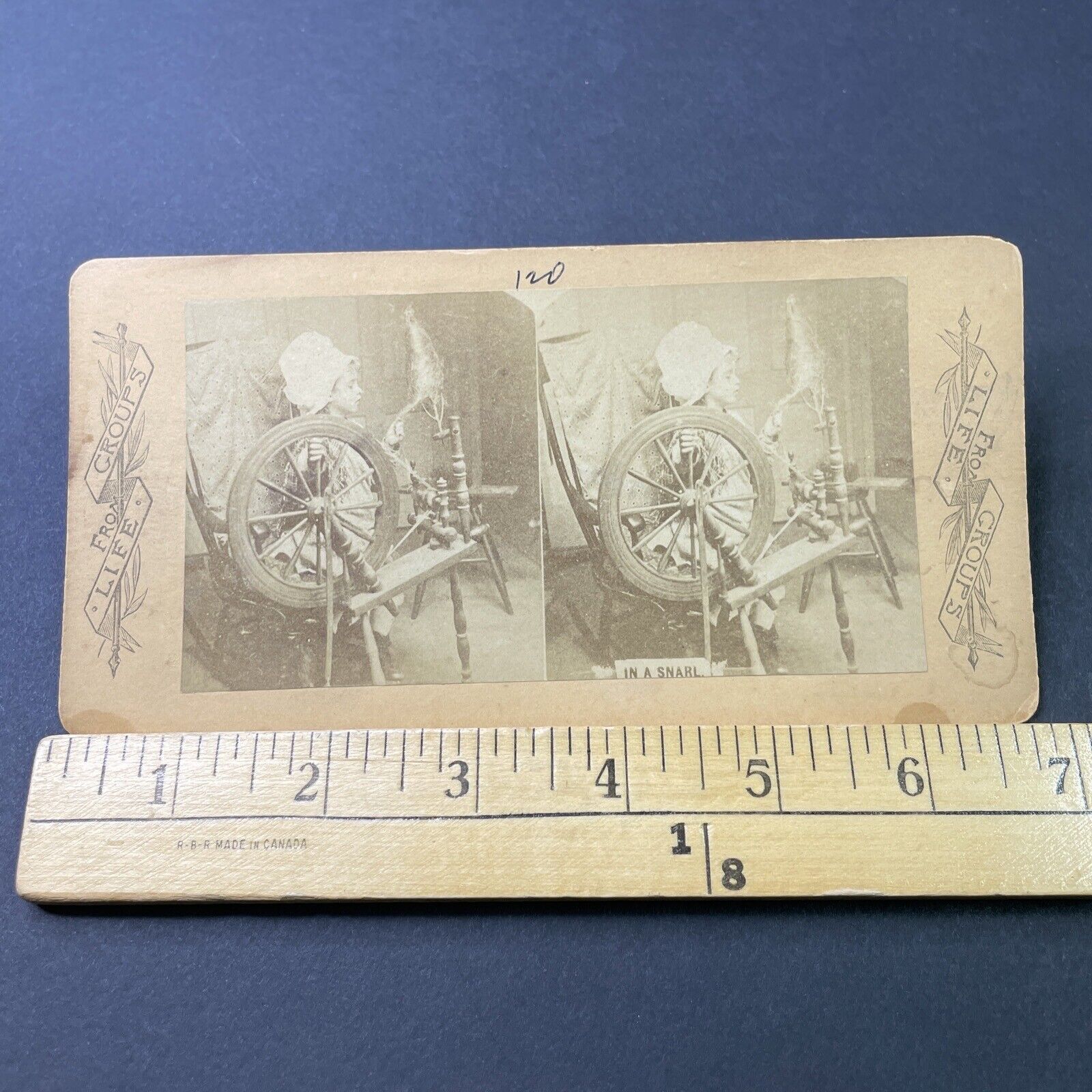 Antique 1870s Girl Spinning Wool Gets Caught Up Stereoview Photo Card P3088