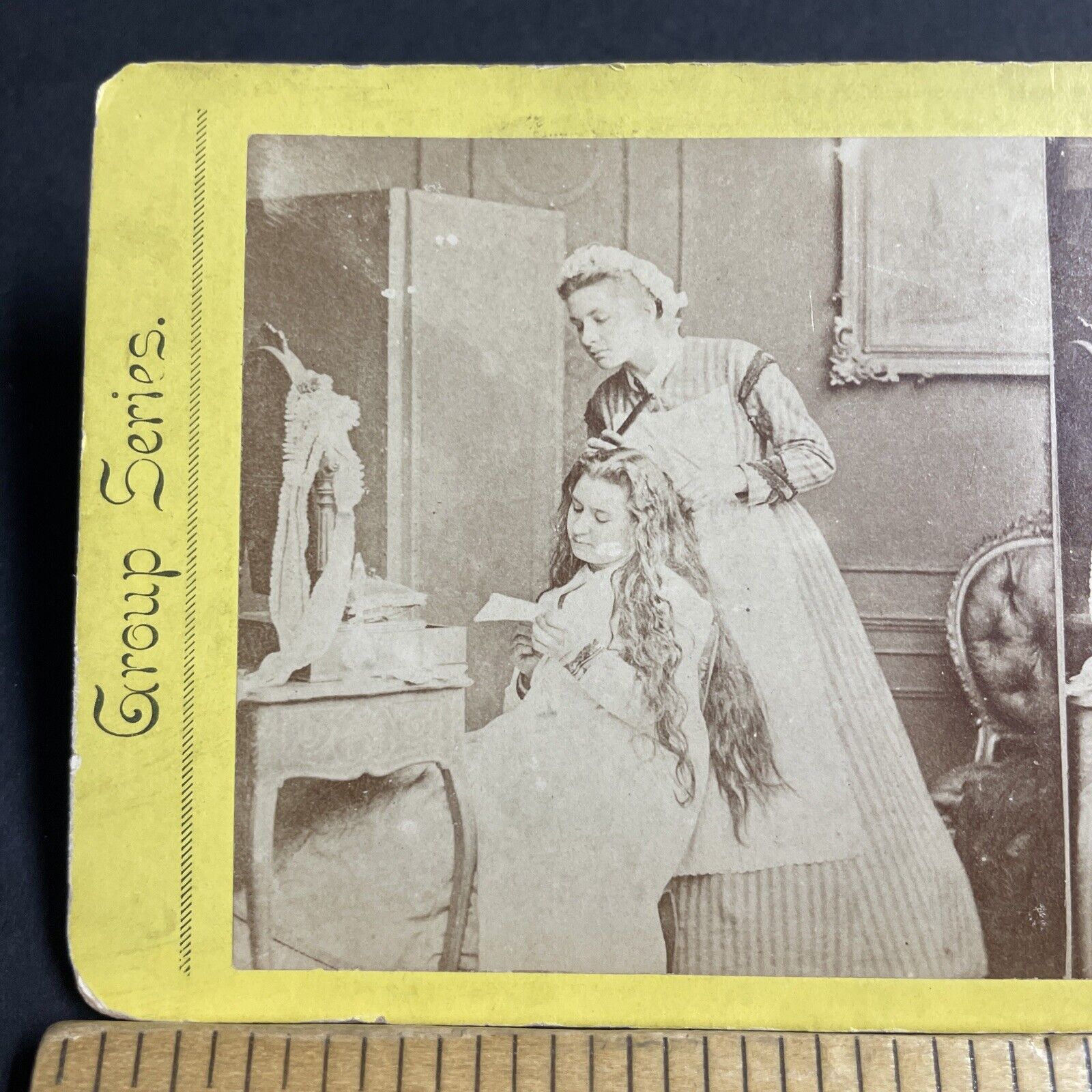 Antique 1870s Maid Servant Fixes Girls Hair Stereoview Photo Card P4815