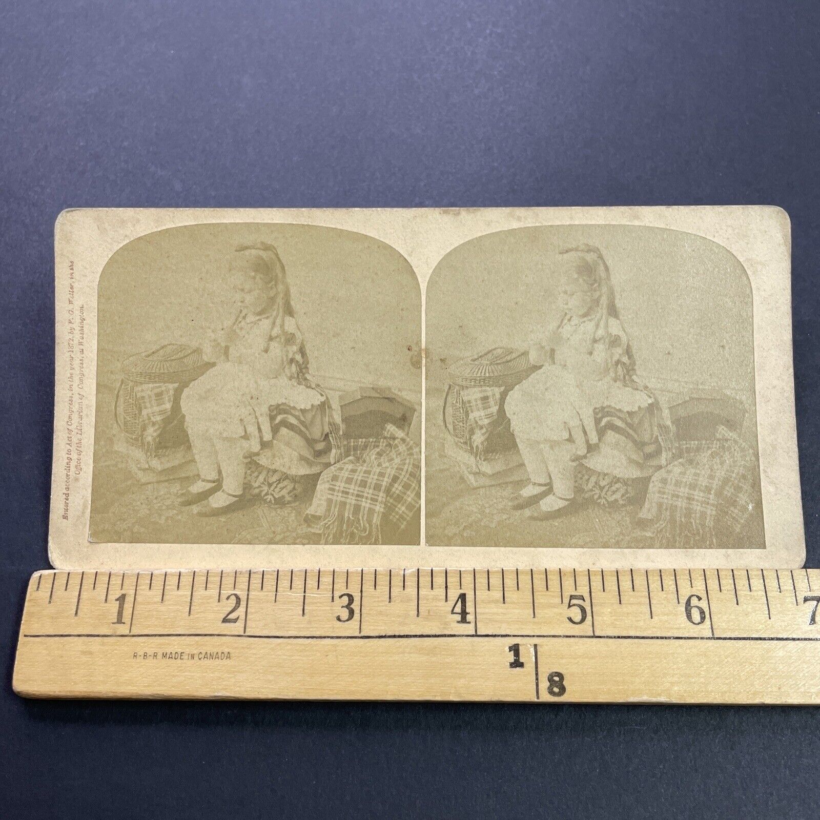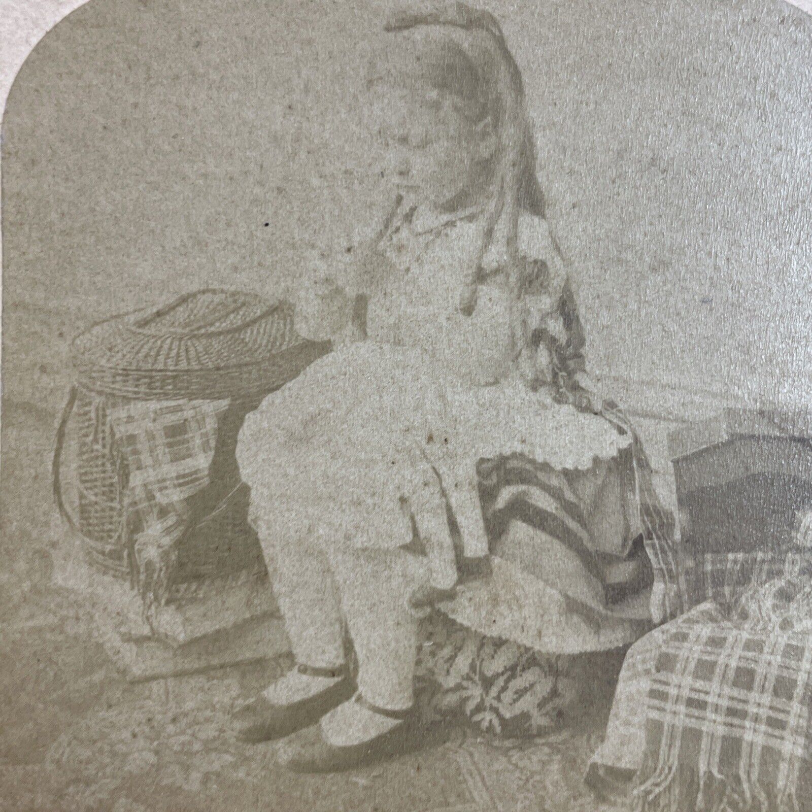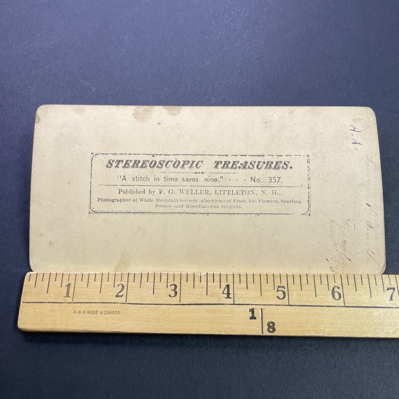 Antique 1872 Little Girl Sewing Her Dolls Clothes Stereoview Photo Card P3531