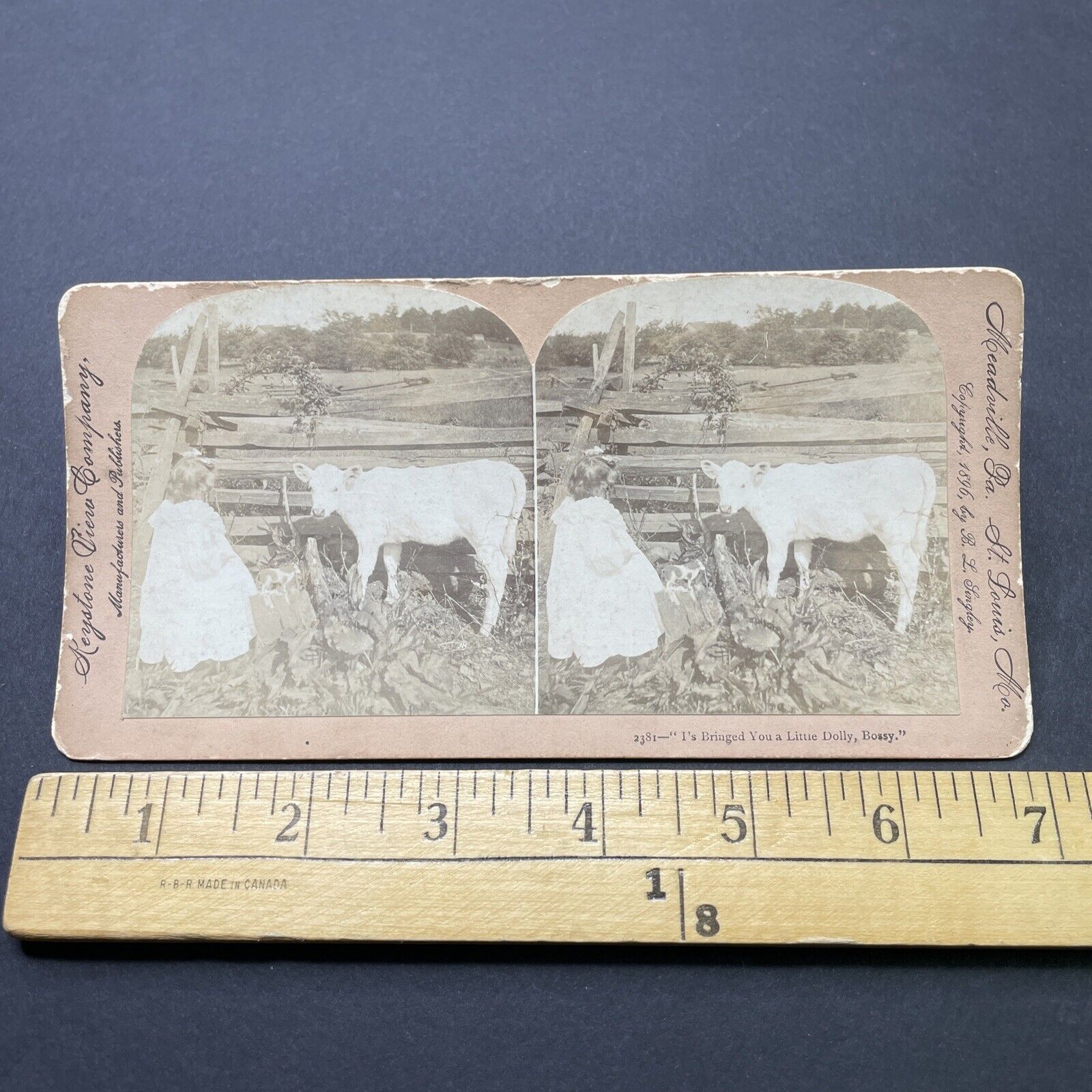 Antique 1896 A Child Plays With Her Calf Stereoview Photo Card P2562