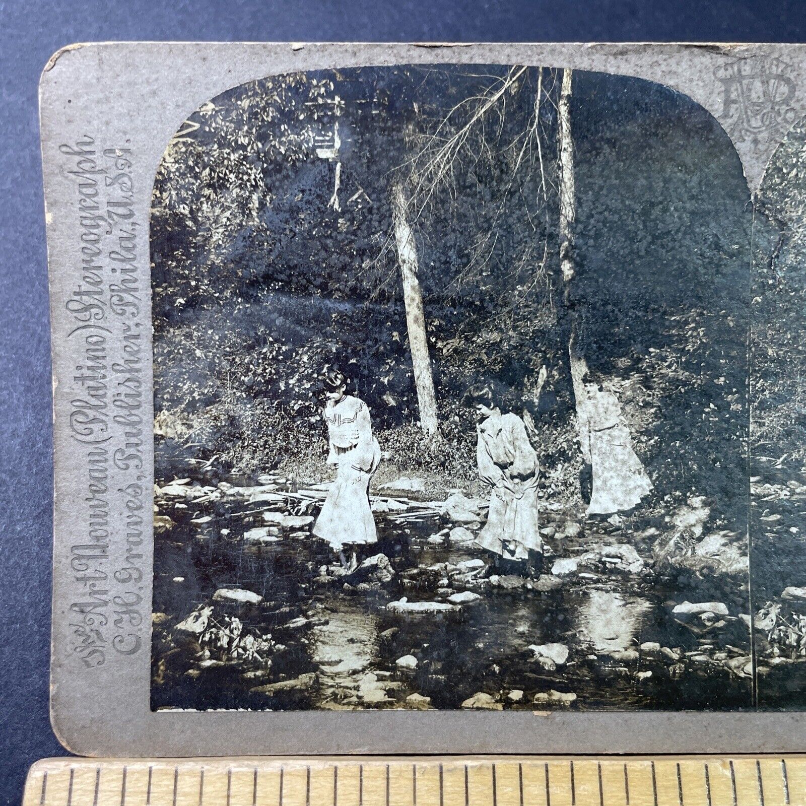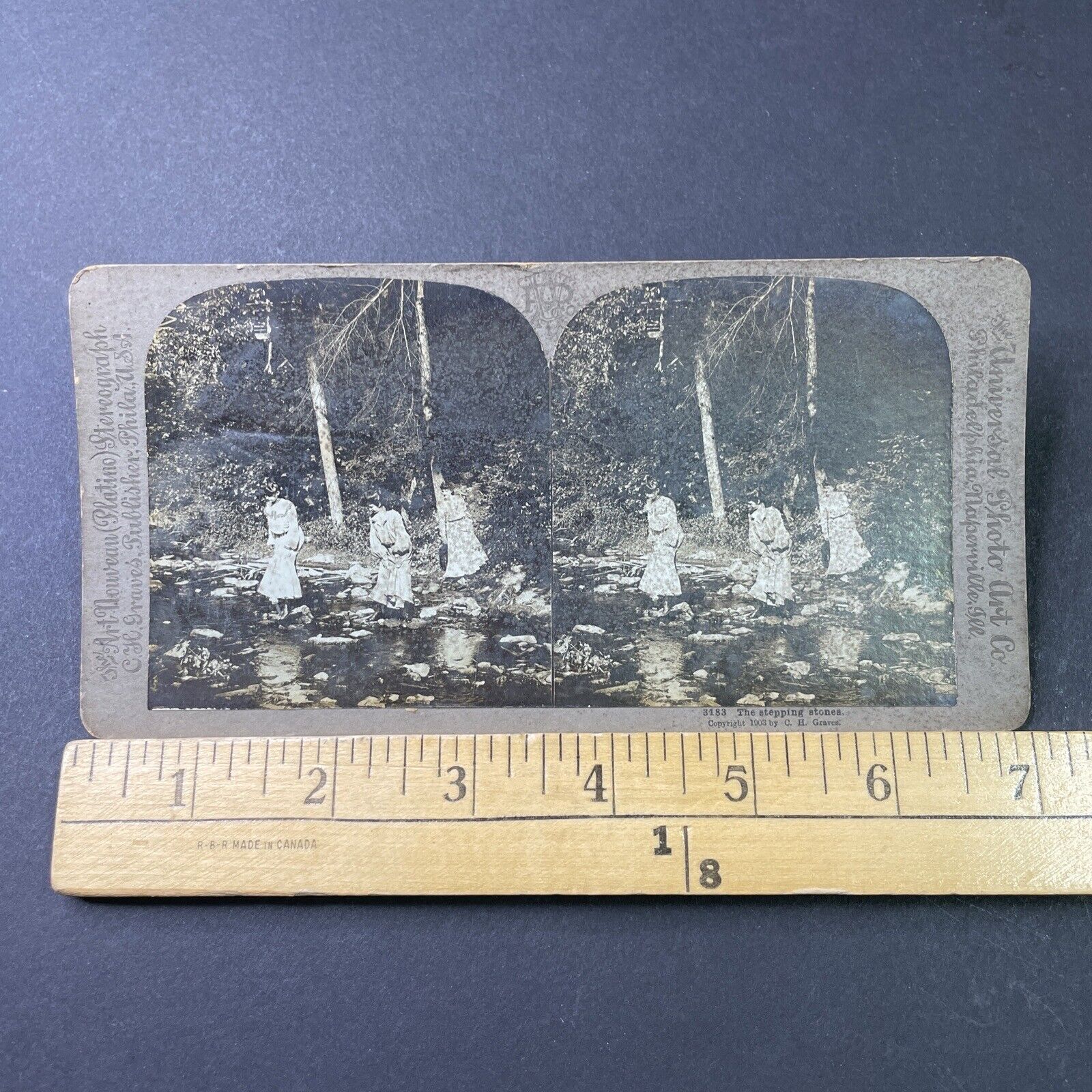 Antique 1903 Women Cross River In Flower Dresses Stereoview Photo Card P2975