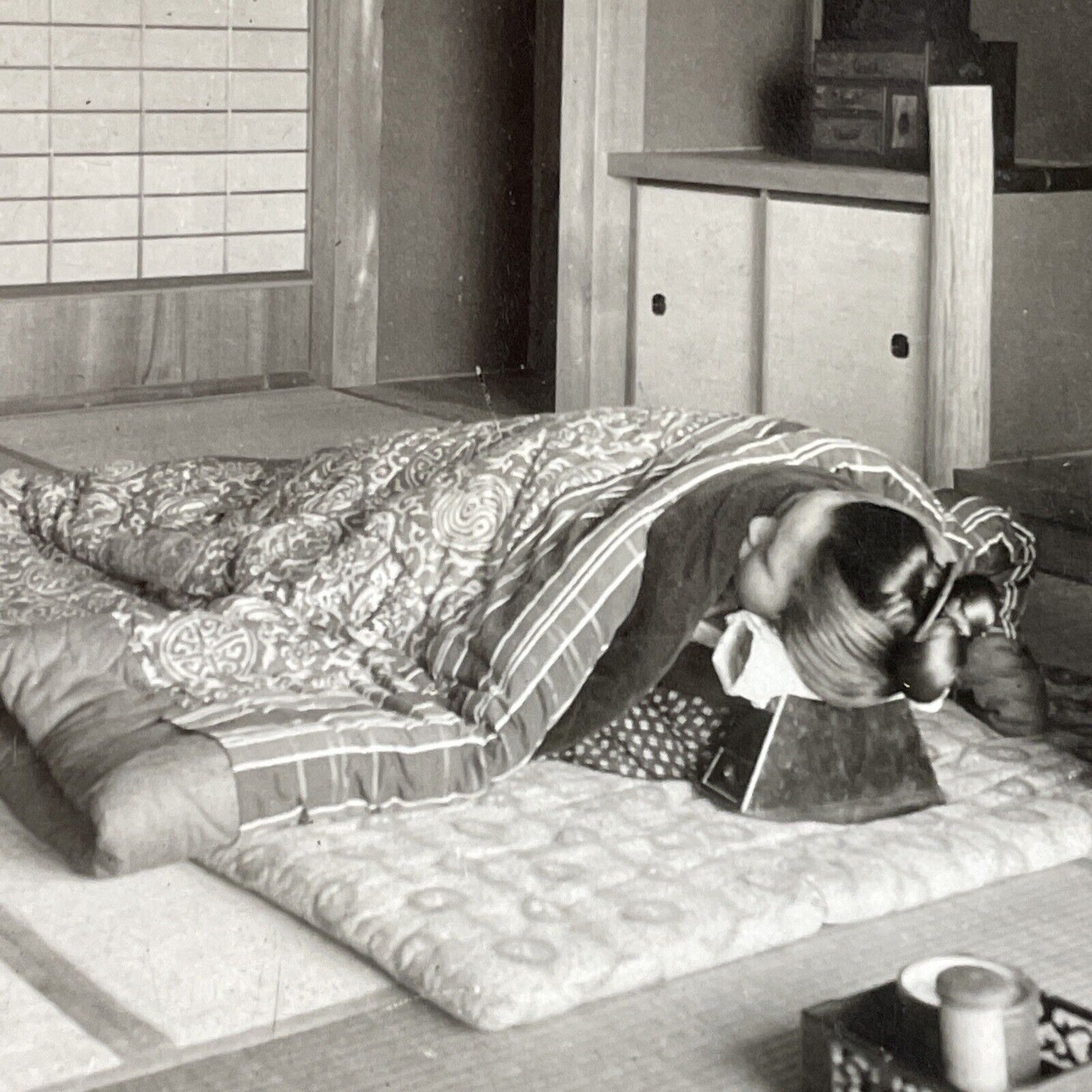 Antique 1910s Traditional Geisha Bed & Pillow Japan Stereoview Photo Card P3623